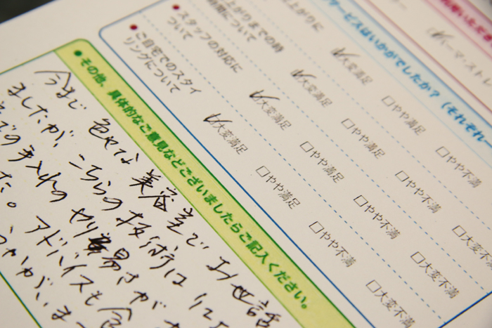 初回数日後に丁寧なお葉書が届いて大変嬉しく、手入れの参考になり、気にかけて下さっている事が伝わりました。今回は更にどのサービスもパーフェクト!ありがとうございました。長く通うことを考えるとお値段も気になりますが、ちゃんと説明して下さり、それ以上のサービスに大変満足です。高木さん、他の方々ありがとうございます。